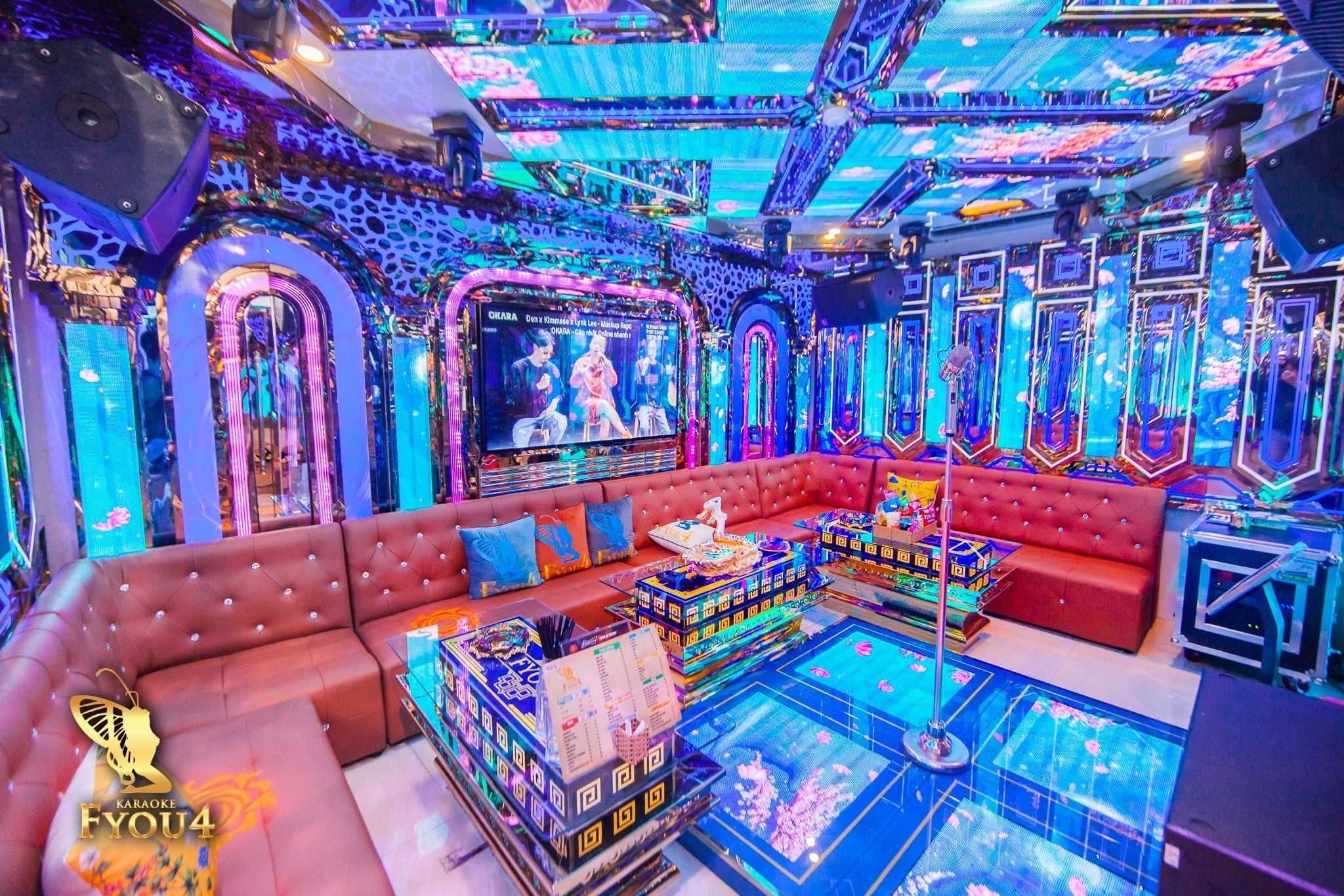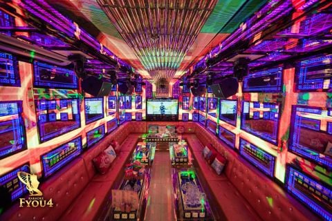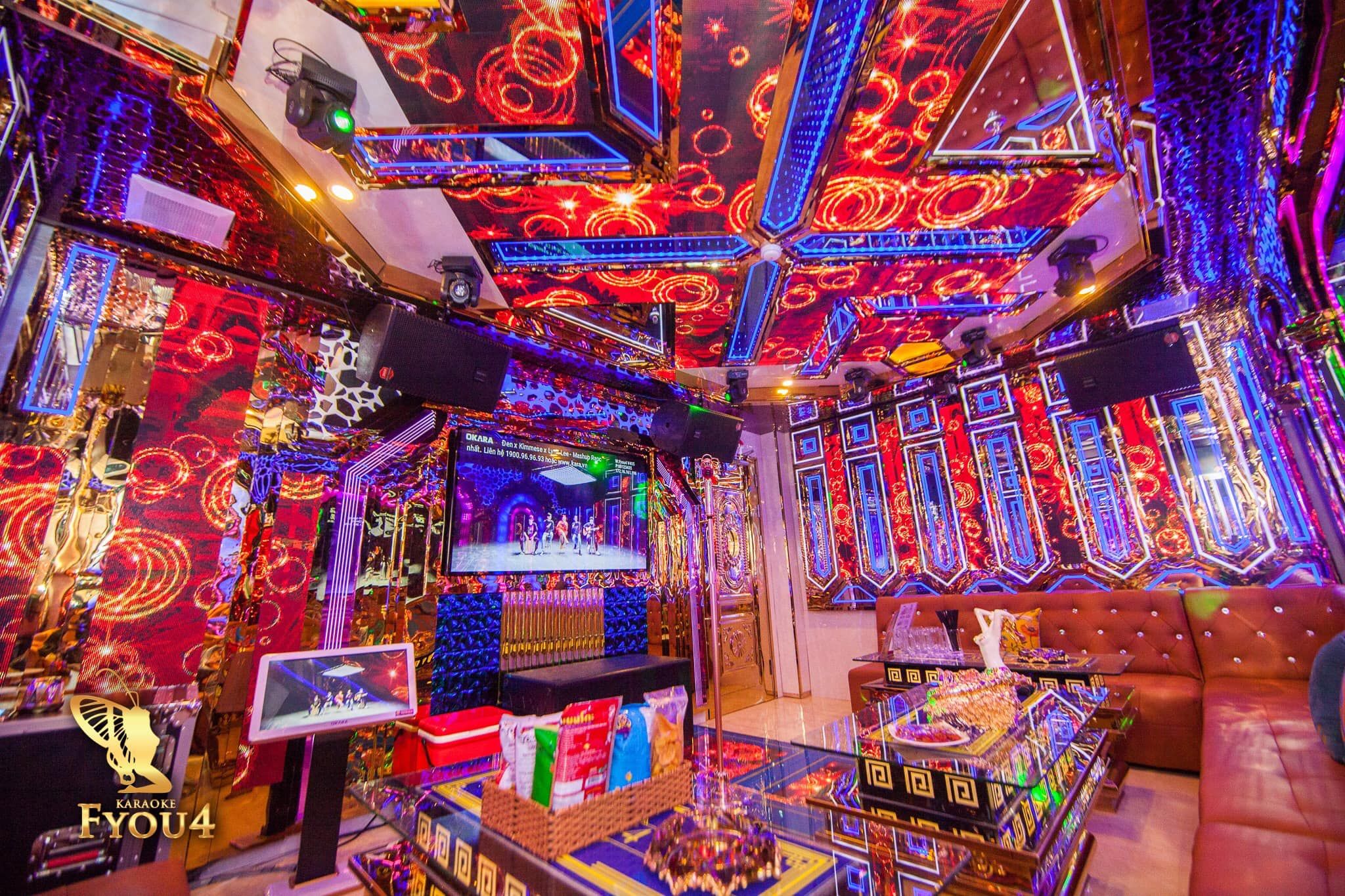 Karaoke FYOU4 tọa lạc sừng sững tại số 334-336 Đường 3/2, Phường 12, Quận 10 – trục đường xương sống sầm uất bậc nhất Sài Thành, nơi giao thương nhộn nhịp ngày đêm. Điểm nhấn khiến FYOU4 trở nên khác biệt hoàn toàn so với hàng loạt quán karaoke khác trong khu vực chính là phong cách thiết kế Hoàng Gia (Royal Luxury) vô cùng tráng lệ và tỉ mỉ. Ngay từ khi bước vào sảnh chờ, khách hàng sẽ bị choáng ngợp bởi không gian lộng lẫy với tông màu vàng kim chủ đạo, từ những bức phù điêu chạm trổ cầu kỳ, đèn chùm pha lê rực rỡ cho đến những chi tiết nội thất được mạ vàng sáng bóng, đặc biệt, FYOU4 còn gây sốt với khu vực nhà vệ sinh (WC) cũng được "dát vàng" sang chảnh, tạo nên những góc check-in "độc nhất vô nhị" thể hiện sự vương giả. Hệ thống phòng hát tại đây rất đa dạng, mỗi phòng là một cung điện thu nhỏ với ghế sofa nhung êm ái, không gian rộng rãi và hương thơm tinh dầu dễ chịu, mang lại cảm giác thư thái và đẳng cấp tuyệt đối cho bất kỳ ai ghé thăm.